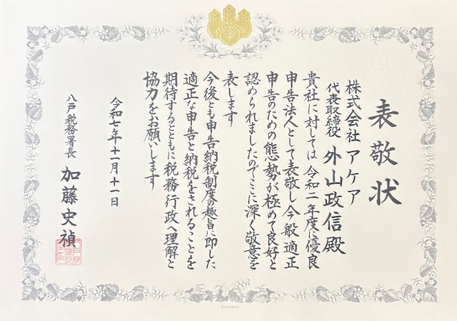 本日八戸税務署より、「優良申告法人」の表敬状をいただきました。