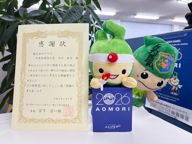 青の煌きあおもり国スポ・障スポの協賛に伴い、感謝状と記念品をいただきました。